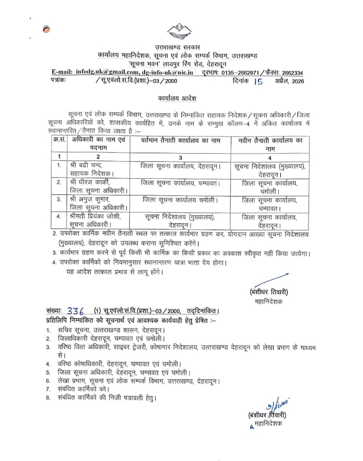 सूचना विभाग में प्रशासनिक फेरबदल, चम्पावत और चमोली समेत कई जिलों के सूचना अधिकारी बदले