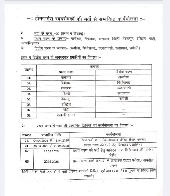 चम्पावत/देहरादून। उत्तराखंड में होमगार्ड्स स्वयंसेवकों की भर्ती को लेकर प्रक्रिया शुरू कर दी गई है। होमगार्ड्स एवं नागरिक सुरक्षा मुख्यालय, देहरादून की ओर से जारी आदेश के अनुसार राज्य के विभिन्न जनपदों में चरणबद्ध तरीके से सीधी भर्ती आयोजित की जाएगी।